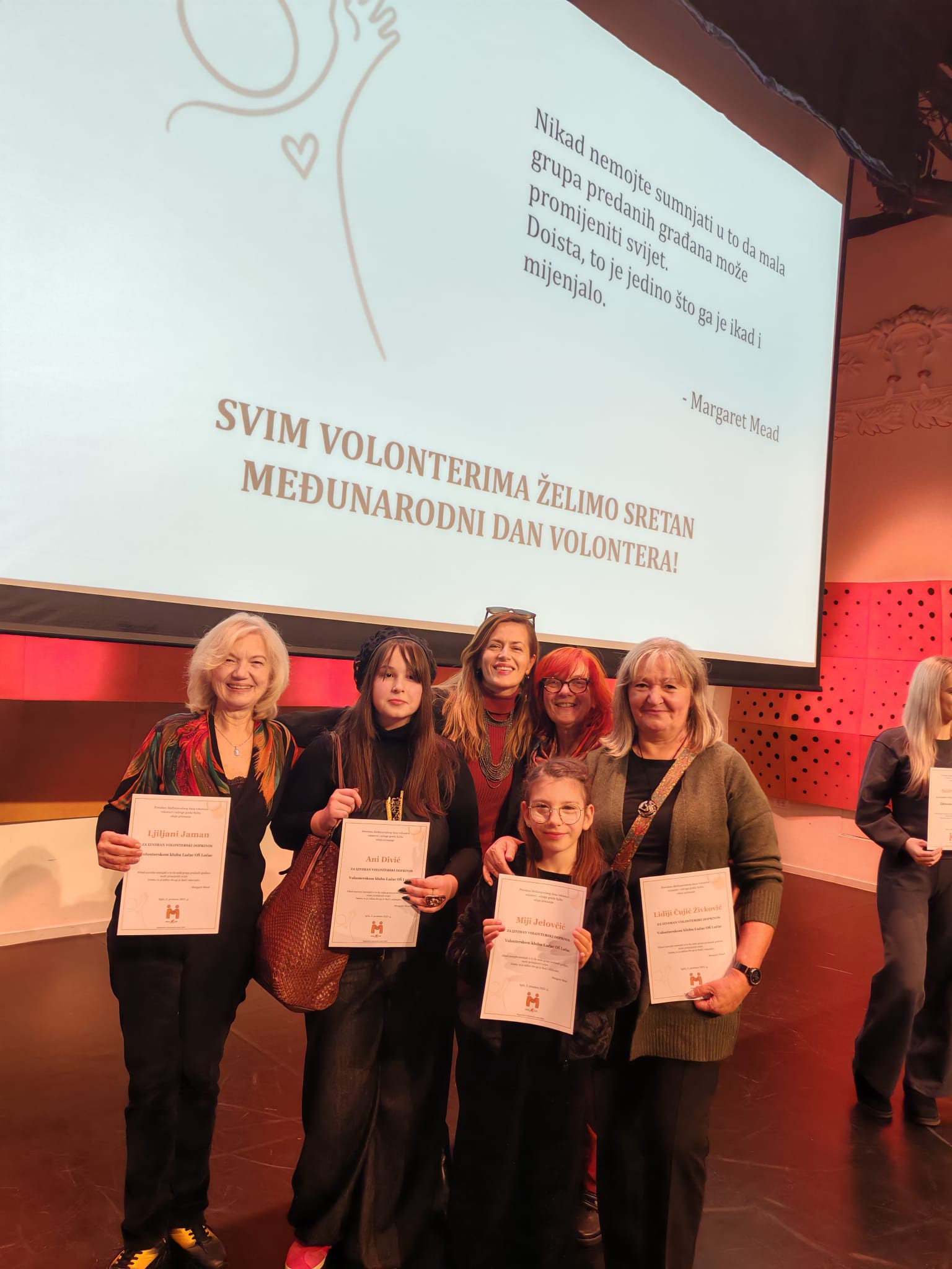 Među brojnim uzvanicima i nagrađenima na proslavu Međunarodnog dana volontera u organizaciji Regionalni volonterski centar Split prisutna se našla i naša ekipica volontera vrijedna poštovanja: Mia Jelovčić 2.r, Ana Divić 8.r, učitelji Lidija Čujić Živković , Ivan Jaram te umirovljena, ali ne i mirna, Ljiljana Jaman